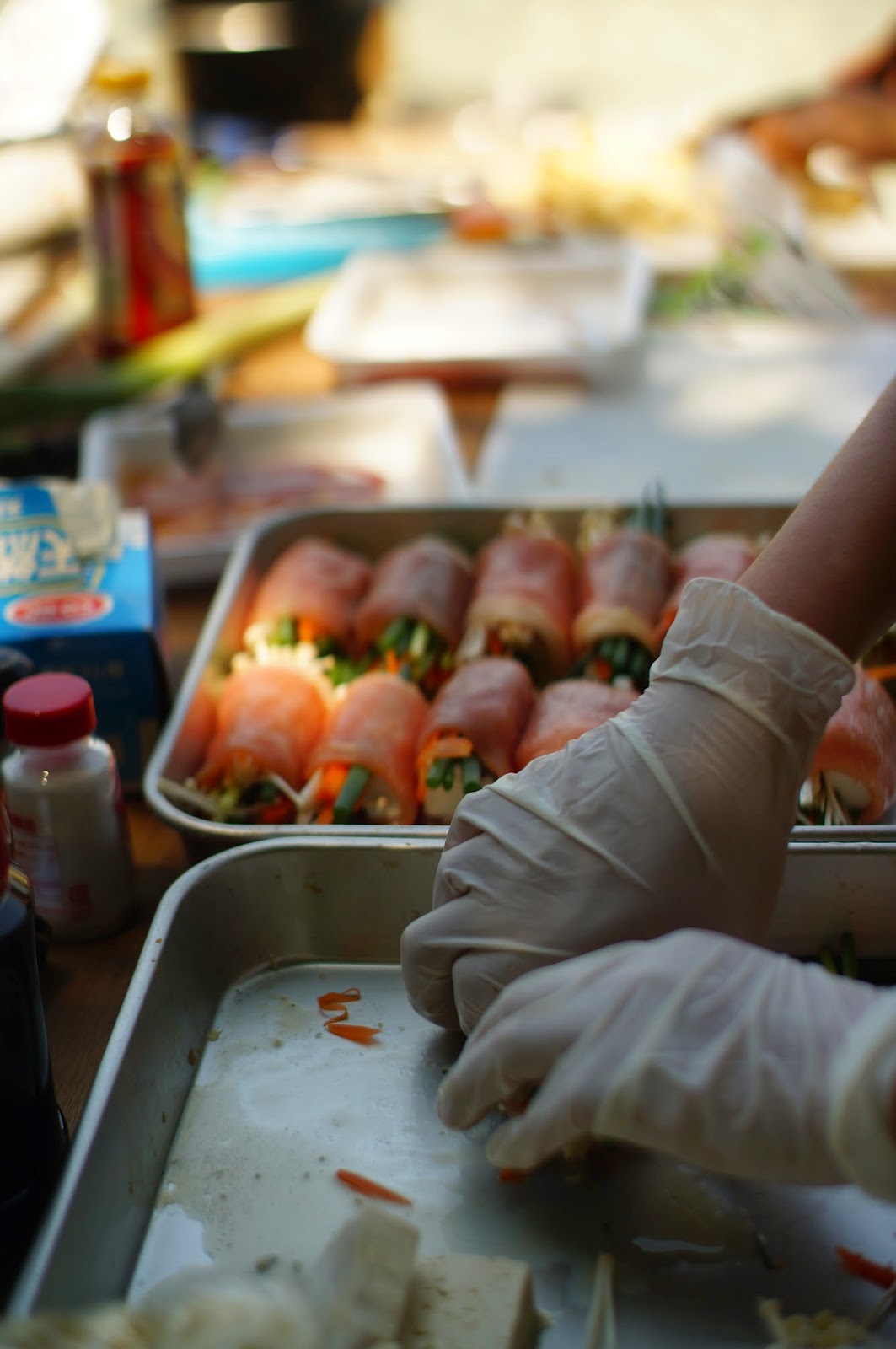 朝のセレモニーが始まる前に調理台を準備し、とにかく食材を切っていきます。